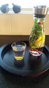 Je vult een karaf met koud water. Voeg takjes munt, schijfjes citroen, frambozen en plakjes komkommer toe.